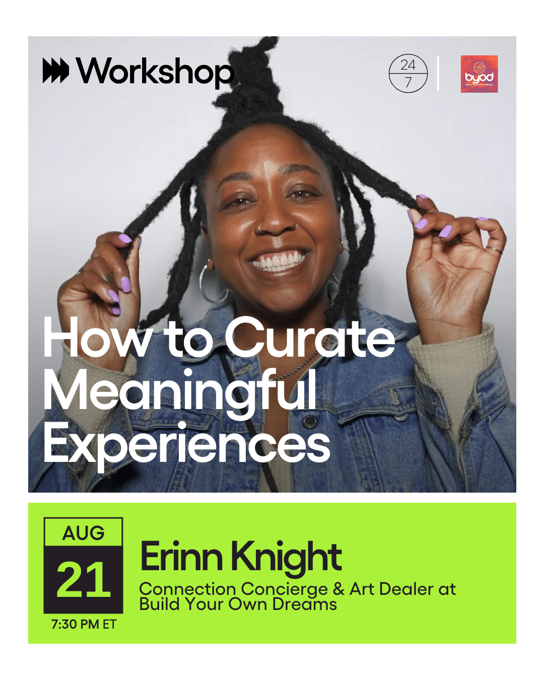 HOW TO CURATE MEANINGFUL EXPERIENCES August 21, 2025 from 7:30-8:30 PM EDT Go beyond just booking shows—learn to create meaningful, audience-centered experiences. Erinn Knight, Connection Concierge & Art Dealer at Build Your Own Dreams, will share about how to shift from artist to architect by designing intentional moments that reflect your mission and connect deeply with your core audience. What You’ll Learn